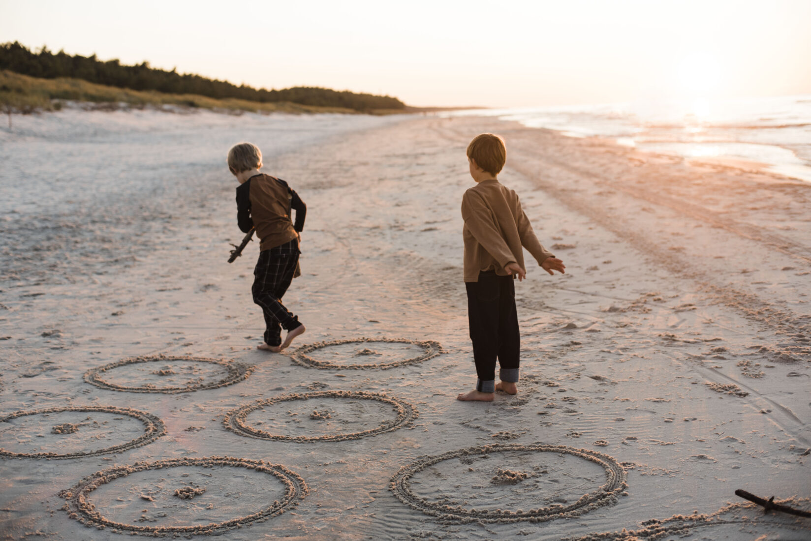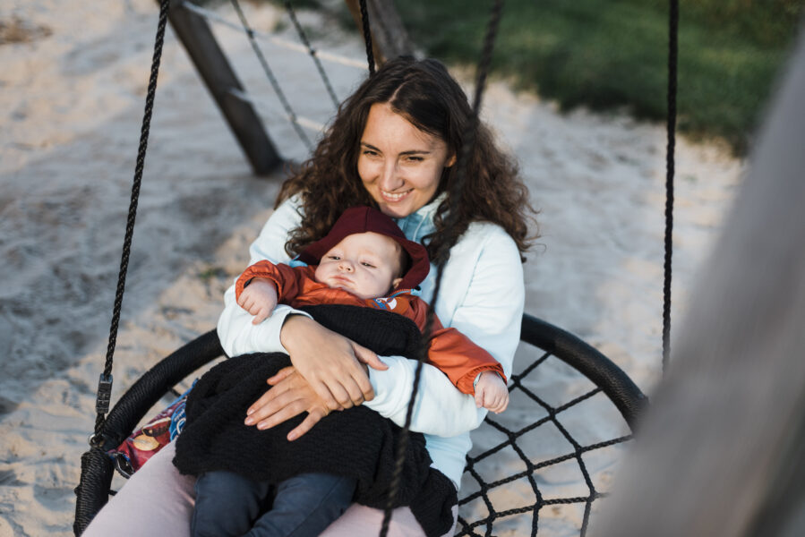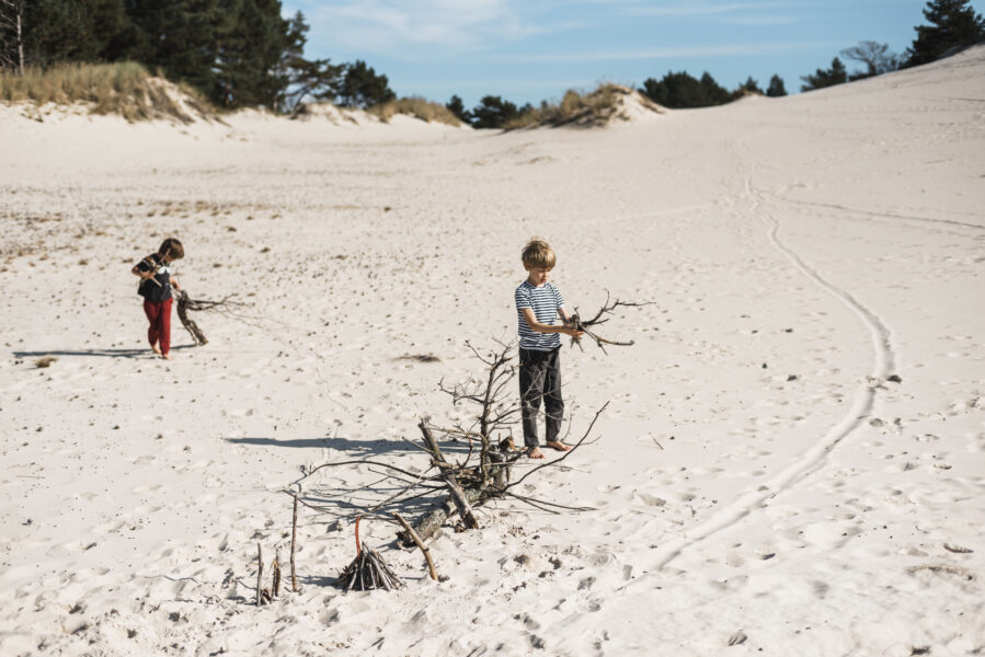 Spacer przez las (wspiąć się na wszystkie drzewa po drodze, zebrać ważne patyki i szyszki) i jesteś na szerokiej, spokojnej plaży… Woda i piasek – to zwykle wystarczy do dłuugiej zabawy (o każdej porze roku). Ty zaś usiądź za parawanem i słuchaj, jak szumi morze.